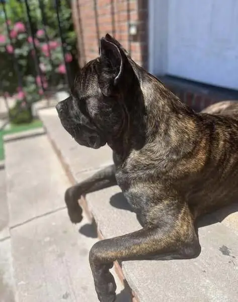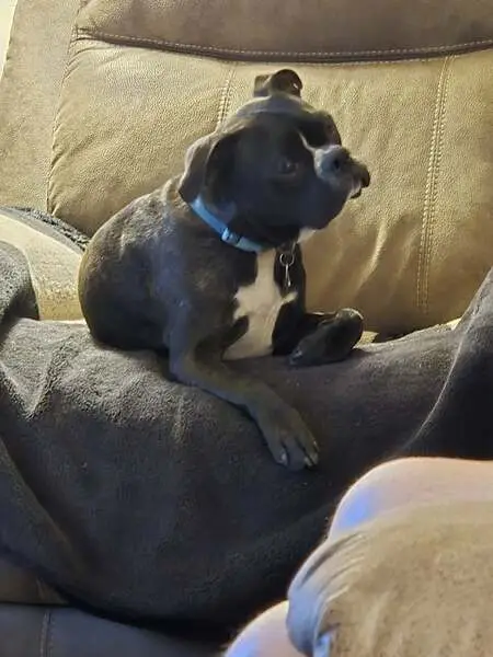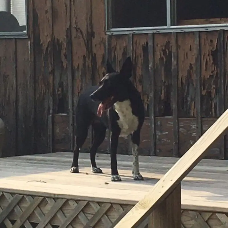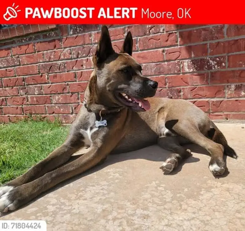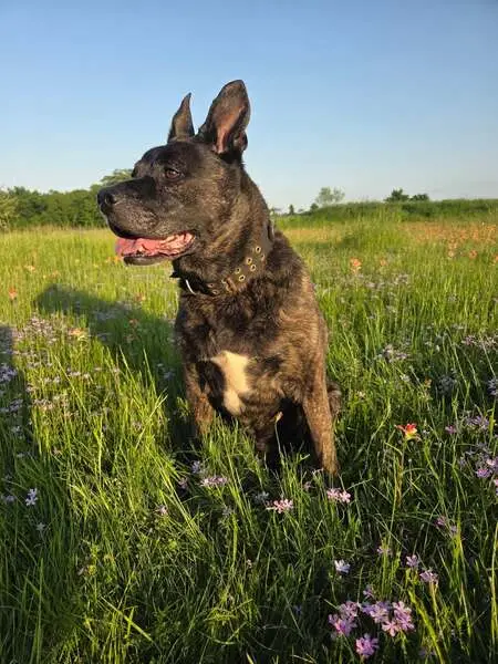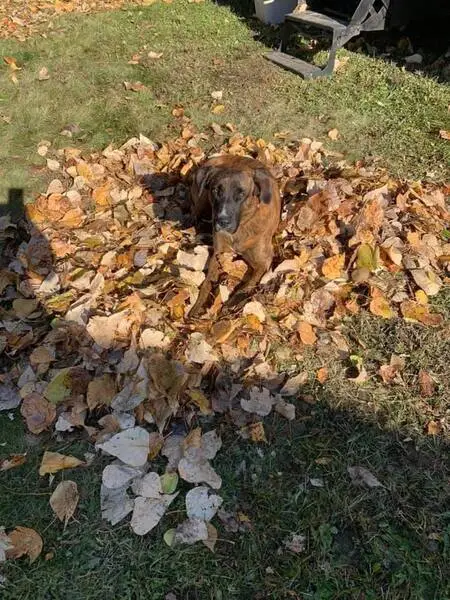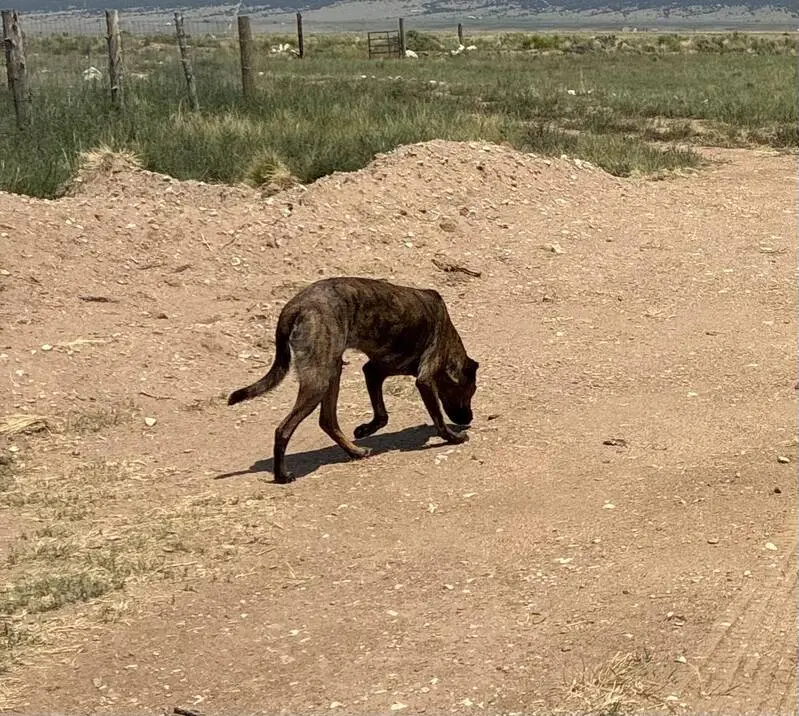 Found on Pokepatch Lane in road. She seemed very lost and extremely hot. Looks like a bobtail brindle cur. She is very young. She is wearing an orange and silverish Grey collar no tags or other identification.
