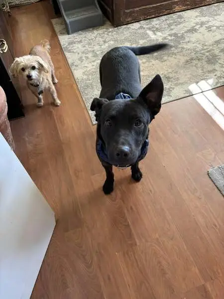 Black Labrador Retriever with a shiny coat.Very sweet looks very well taking care of nails looks trimmed. Seem to be friendly rolled over when I walked towards him
