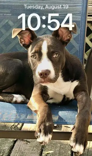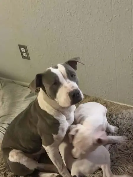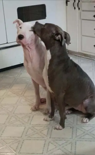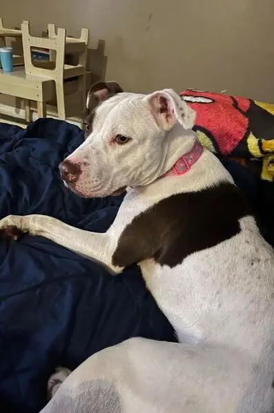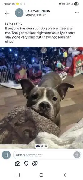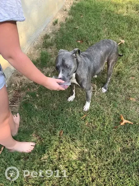 She is silver and white. No collar, very friendly. White chest and socks. Looks to have a tattoo from being spayed. Loves families and children.