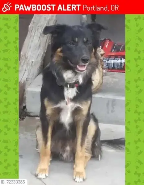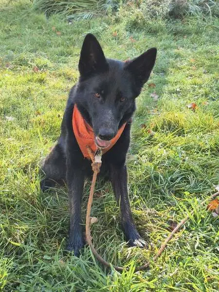 German Shepherd. A young boy with an orange and black collar. Very healthy-looking dog. No microchip found. The owner is found. They are back together!