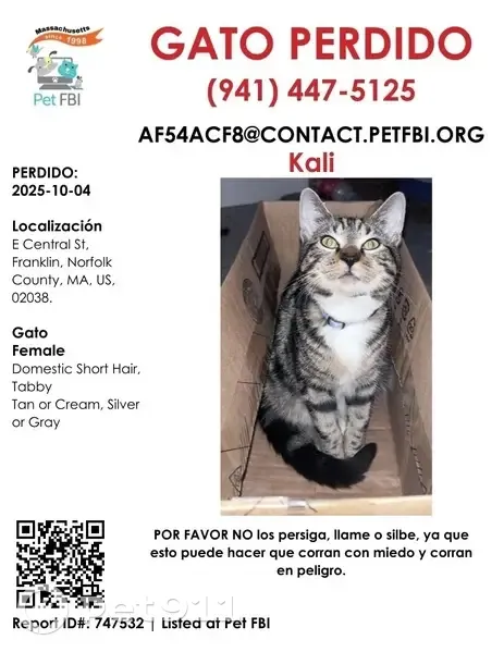 She is tan/greyish with black triped and white chest fur, paws have white on the toes, has a pink collar with skulls on it. Her nose is black and she is a short haired tabby cat