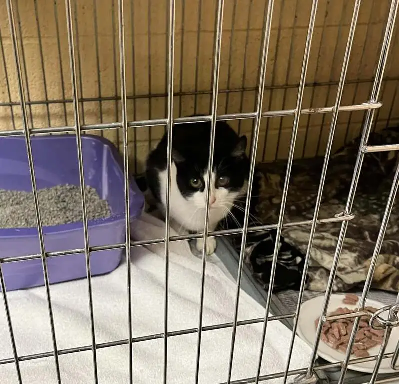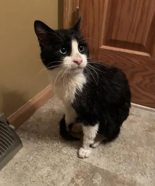 She is a tuxedo (black and white) with white legs+paws and a black with white “pepper” fur on her back. She had a long white streak on her nose up to her head. She is about 1.5 years and 13lbs. She is wearing a purple silicon calming collar. We just adopted her and her carrier broke so she ran scared and confused.