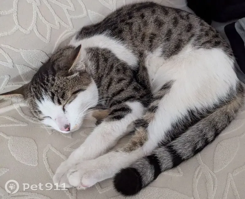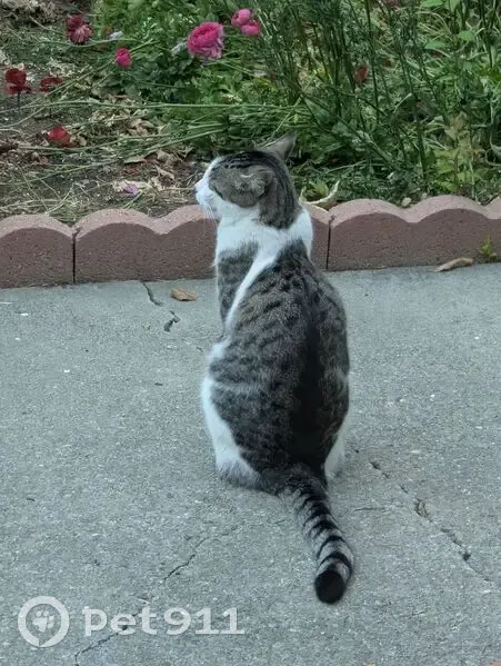 Male indoor/outdoor cat. Short hair. White, brown, gray with black spots/stripes. Dark spot on nose. Yellow/beige spot on lip. Black lining on half of mouth. Stripe pattern on one front arm. Neutered and has microchip.