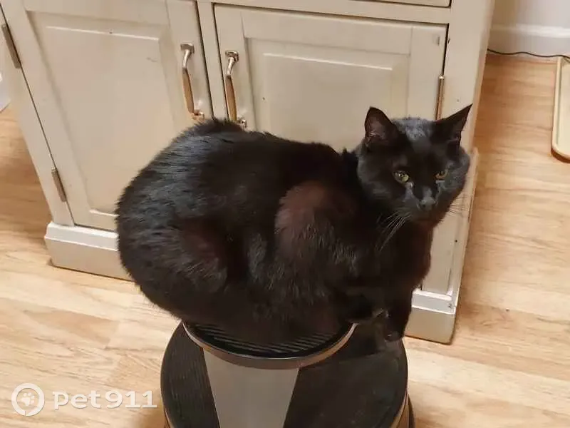 Slightly overweight male black cat. Very friendly, answers to Midnight, and loves any and all food. He is 100% an indoor cat and is neutered. He has a few white hairs on his chest and around his body, but they are only visible if you're looking for them and he should otherwise be completely black. Ran out the door while saying goodbye to friends (he likes escaping outside to eat grass) and wandered off in our neighborhood where we hope he stayed within.