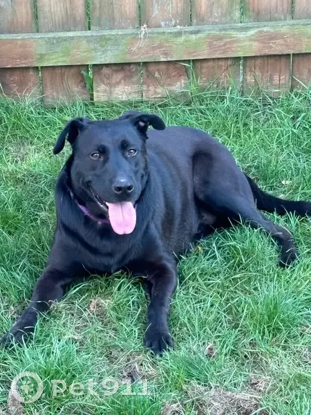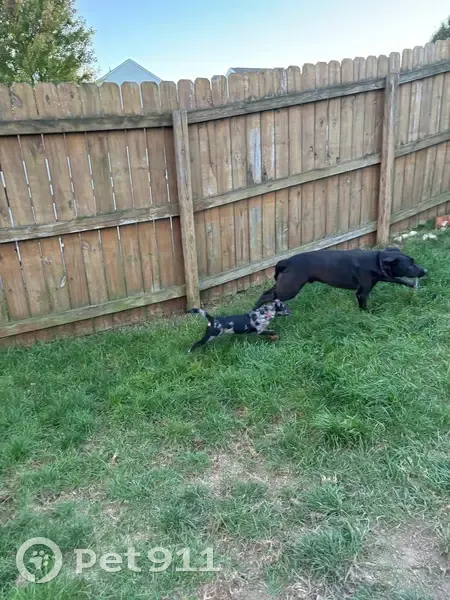 Mac is black as spots on tongue and a split ear. He loves people is very friendly. He got out by a hole in our backyard fence. He has no collar, but he is chipped.