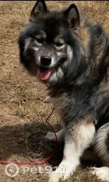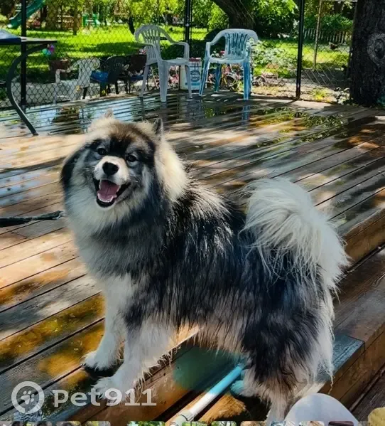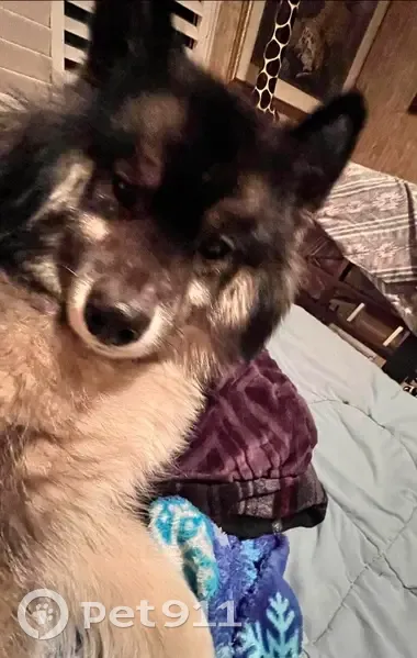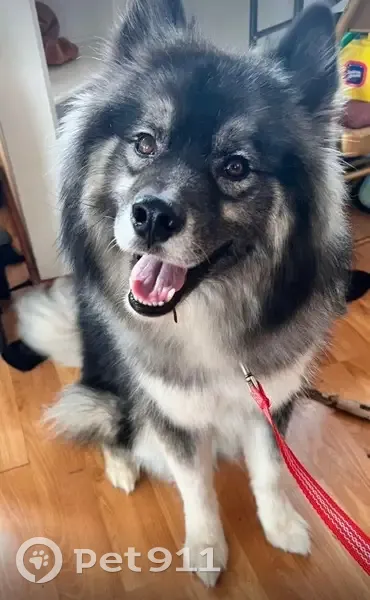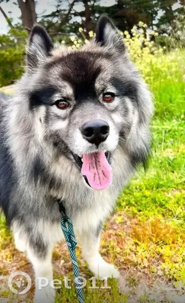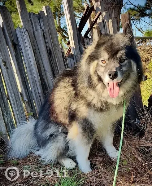 Husky Keeshound Malamute Pomeranian Chow Chow Mix Mostly dark Gray undercoat with black overtones. Medium Size. Almond shaped Brown Eyes. Light Gray belly paws chest and silvery white bushy curled "spitz breed" tail. Erect black ears . Black agouti husky face mask markings with symmetrical black poke-dot dimples on each side of his big smile. Always smiling. Friendly, playful and goofy. His fur is plush and dense like the best fuzzy blanket- almost chinchilla soft and very long whisps on his tail like a rooster. He weights less than he looks due to all his thick Keeshond Fur! He is prone to getting foxtails stuck in his pawpads and fur and may need that immediately addressed. His fur is fine and must be groomed daily- especially when outdoors roaming fields full of foxtails. Which this area is for acres! His ears and nose and throat are all very sensitive to foxtails getting imbedded especially inbetween paw pads. He does not like to have male strangers handle him roughly. He may be reactive on leash around other dogs and cats and Should never be around chickens small prey animals alone. Older kids are ok- as long as theybare respectful and not too noisy or overstimulating. He is gentle but prone to anxiety himself and Cannot be left alone. His crate is his happy place if left alone. Loves car rides, but not being left behind and can cause major damage, dig and escape almost any fence and enclosure- and lead. Not used to living in city or suburbs. Hes Oblivious to traffic and cars. Enjoys tasting toxic chemicals like Lysol cleaners especially citrus-- dont ask why just hide all cleaners ! He has eaten latex balloons and chewed on plastic toys. Constant supervision is necessary.