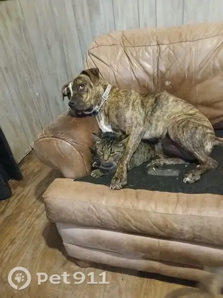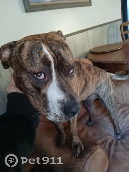 Brown Brindle white between eyes and patch on chest. Orange reflecting collar. Chased a squirrel with her brother off the property hopefully they are still together