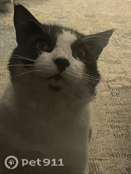Lost 4 miles from home. Slipped out of carrier and ran across the street at NW Highway and Centerville. Last possible sighting at Peachtree Square Apartments on Saturn. Adult black and white male cat, not fixed, green eyes, black nose and black spot on chin.