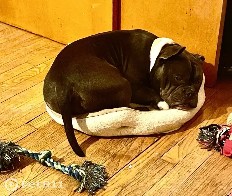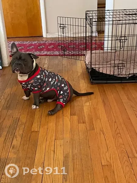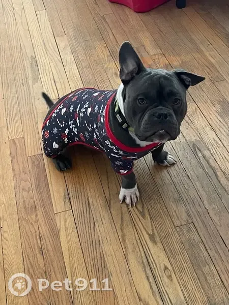 Sunday at 11:00 am my dog Leo went missing from our backyard. Leo - Micro Bully Age: 2 Height 1.5 ft Weight 48lbs Color: Grey with white chest Wearing: Lime Green collar Is microchipped. Very Friendly, Rarely Barks. Does not bite or nip. He will follow you and jump up on you to kiss you. Frenchie personality, without dramatics. Hyper. Very sweet. Has skin infection at the base of his tail.