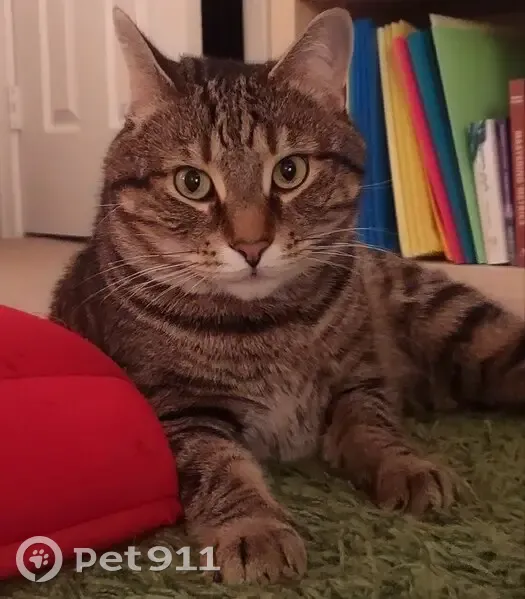 My brown tabby cat, has been missing since April 4 around 6 PM in the Masonvale neighborhood. He is about 13 pounds, very friendly and usually comes when called, especially if you sit down and speak to him calmly. He is microchipped.