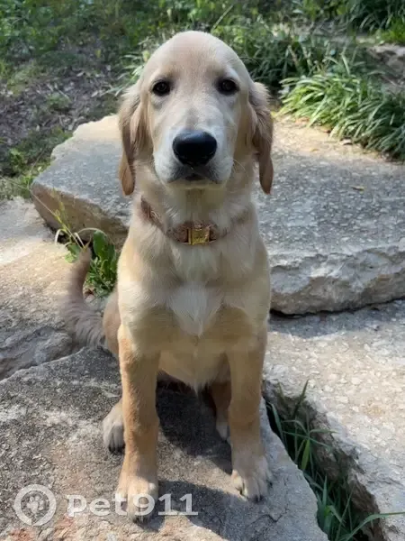 5 month old light colored golden retriever. She’s wearing a pink collar that has flowers on it but no tags. She ran away when a train came by very loudly close by.