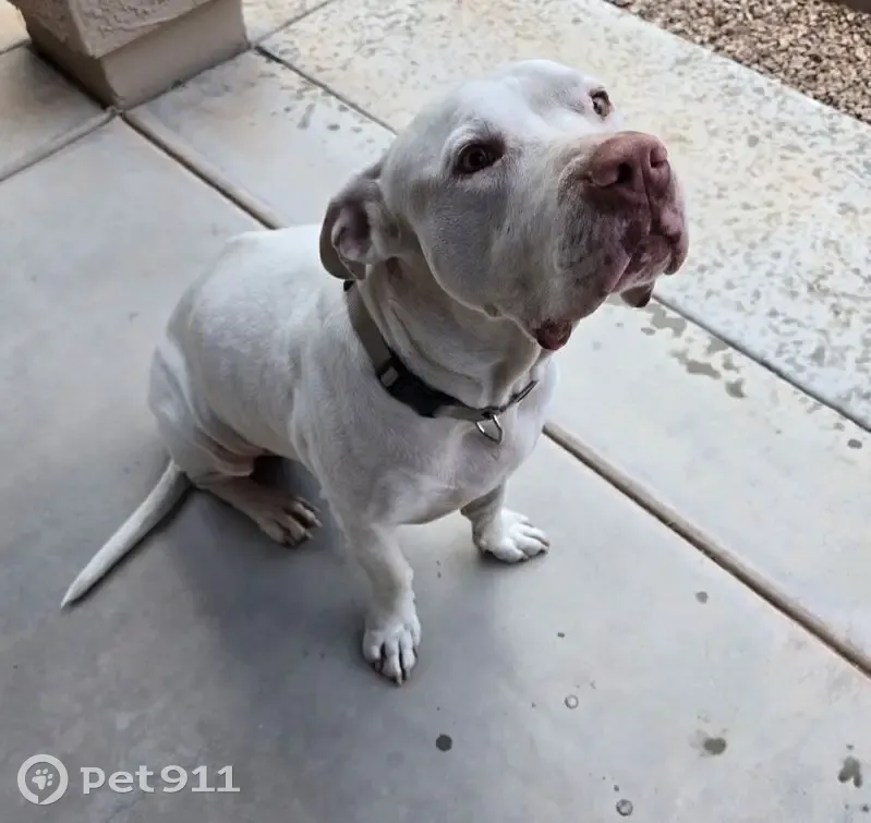 Large, white, adult-male (altered) pitbull; brown collar/no tags; no micochip. Must have had a recent medical procedure, as he has some stitches on his belly. Very sweet and calm. Understands commands and walks well on leash.