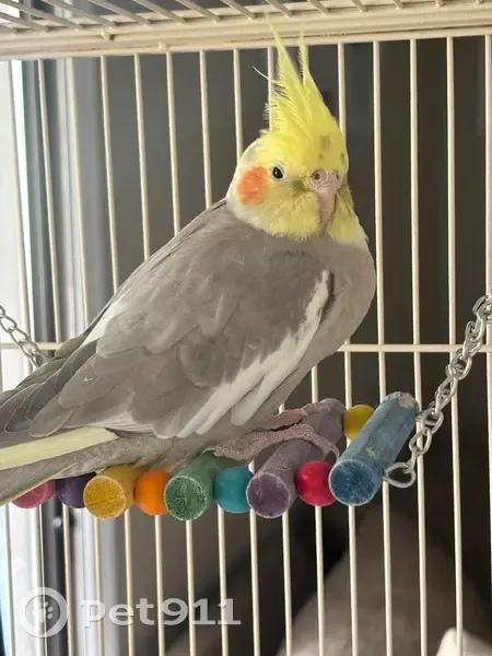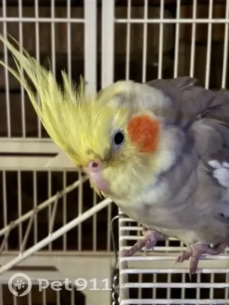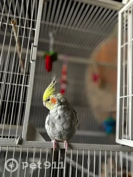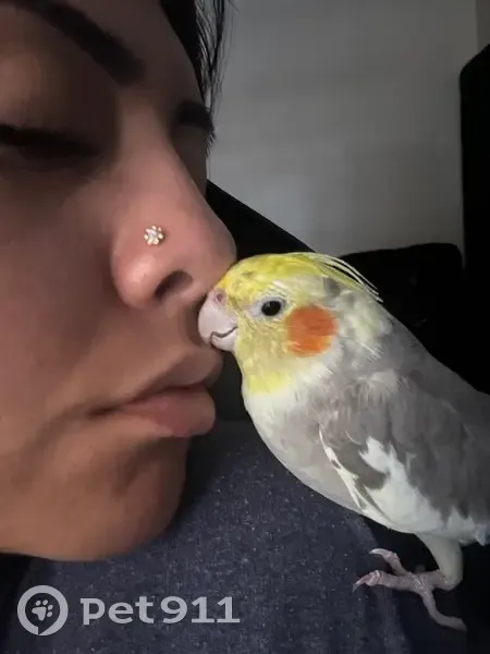 She has grey spots all over her top yellow feathers and she has white on her wings under the grey . She’s very sweet and has eggs in her tummy wen she left