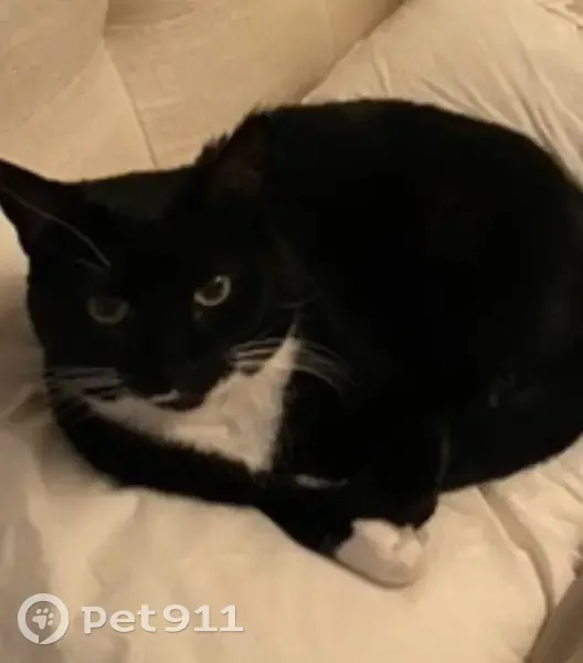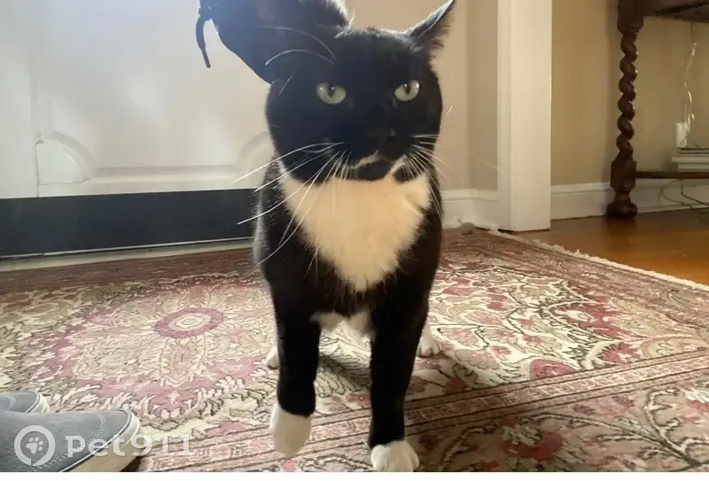 Black with white chest and paws. Green eyes. She is friendly but typically scared of people she doesn’t know. Snuck out the front door.