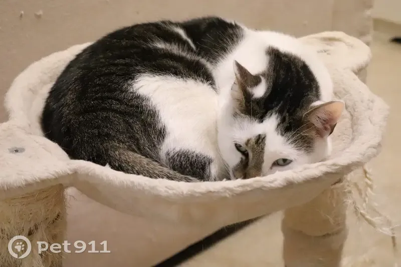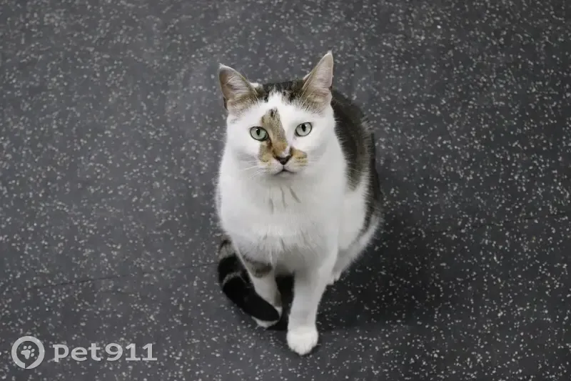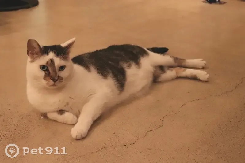 Majority white with brown tortoise shell markings. Very friendly, loves attention, has never met a stranger. The side door was left open and he got out - it was about 8-10 minutes before anyone noticed the door being open and we live near a lot of woods.