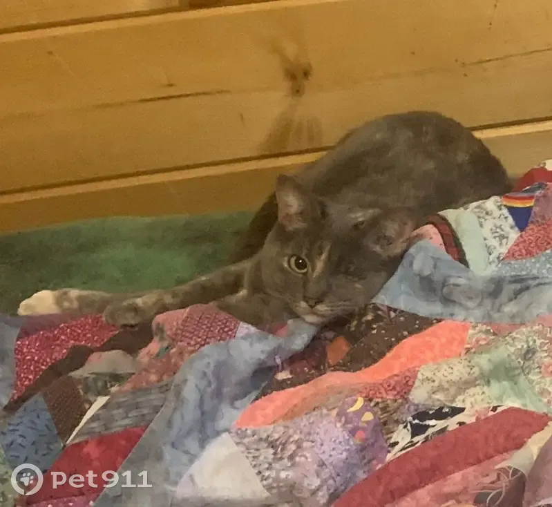 Grey with 2-3 whitish paws and light streak on forehead and whitish chin Short haired One eyed Small (~7 pounds) Female Might still have collar with bell Not usually scarred of other humans or animals but sometimes skittish