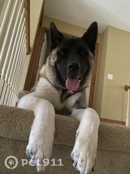 Tri-color Akita - Black face, brown and white body, curled tail. Her front to legs are white looks like she’s wearing pants. She has a birthmark on her tongue. 0500 on 8 October she got out of my hands and took off toward an old golf course/forest. She is wearing a pink collar with my number on the tag and has a red leash still attached to her (15ft slip lead).