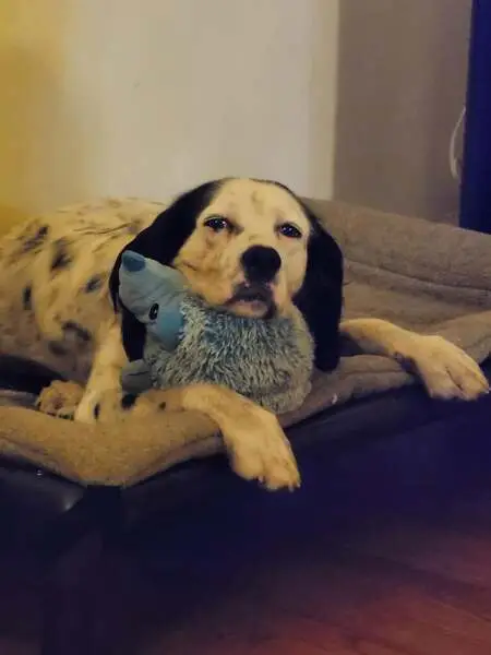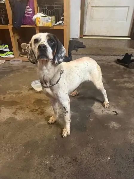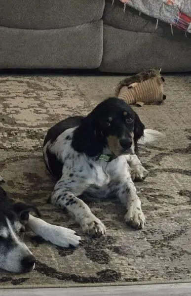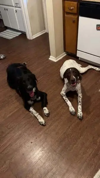 Found two of them roaming together in my neighborhood yesterday morning 3/28. I saw them again and brought them home with me after I stepped out to get dinner. They are both male and pretty big guys. One is white with black scattered spots all over body and has semi solid black ears with some white spots. The other dog is black for the most part but has ashy gray color on paws and scruff on face. They are very docile and sweet. Pls contact me if they are your dogs.