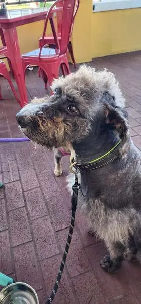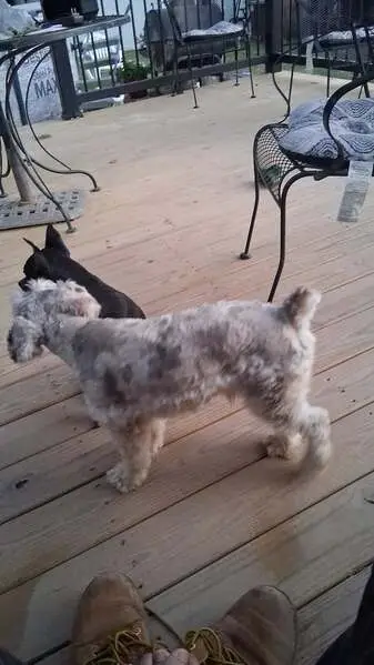 Light brown paws and top of head, fade to black on the back, shes very friendly with people, licks like crazy and shows belly