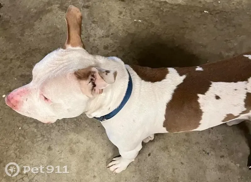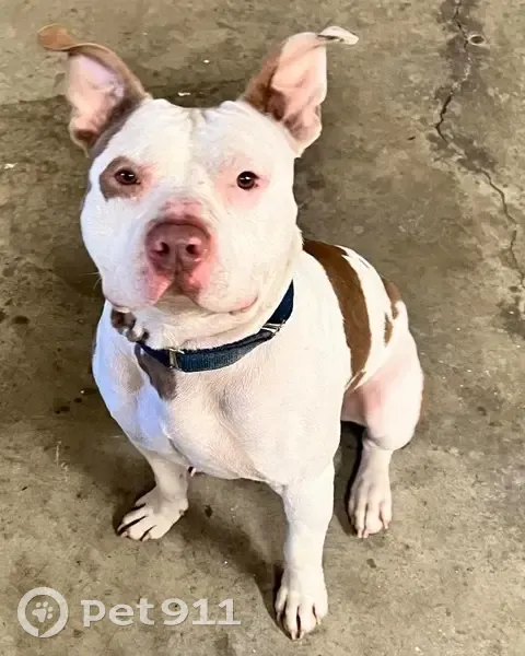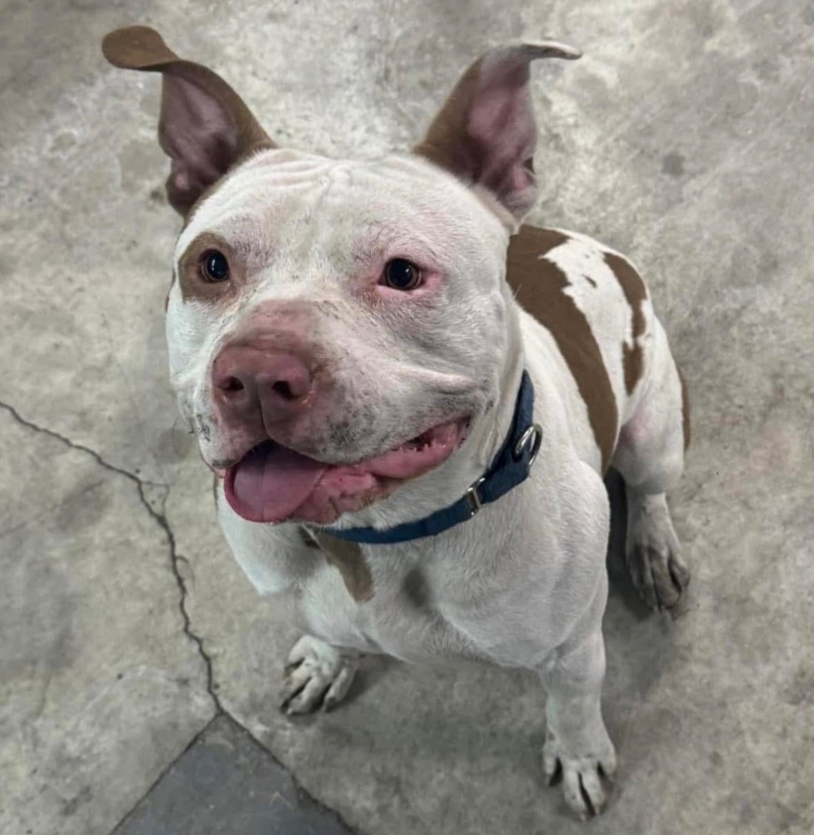 White with brown patches XL pit bull. Dark eyes. Brown patch around right eye. Jowls curl up when he smiles. He has been fixed.