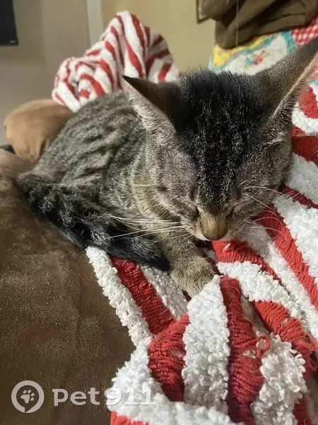 She has a very distinct meow, almost like a baby cry. Grey with black stripes. Long whiskers, and tends to have watery eyes. She got out of the house early and took off with no sign of where.