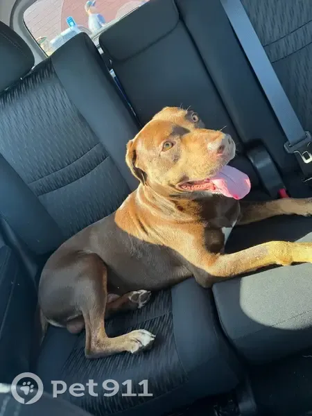 Brown pit/lab mix with white on his chest and...