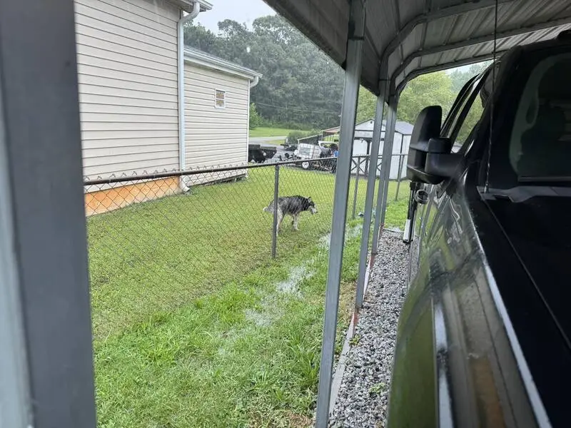 She is a black and white husky German Shepherd mix she's very loving she has a purple collar with a rabies tag as well as a purple bandana because she had just gotten back from the groomer