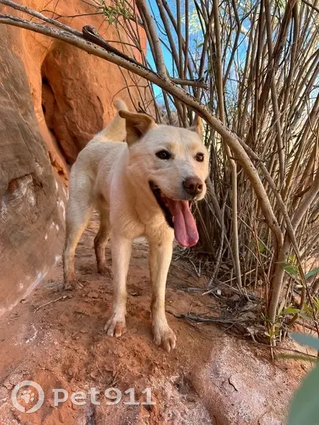 5yr Male white/cream Korean Jindo, red ears, half flop ears. Disappeared from camp after chasing a herd of deer towards the canyon. Closest water source is the dirty devil river, closest river access point is the angel point west trail.