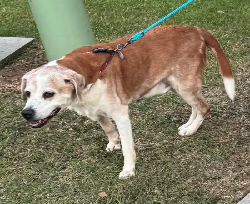 Merged with usl514588 listing. The reason is duplication of information. Description of the duplicate listing: Reddish long hair husky like mix with greyhound “shape”. Long legs; underbite. Skittish. Will not bite Kind dog. Scared probably. Camo collar. Chipped Tags with phone