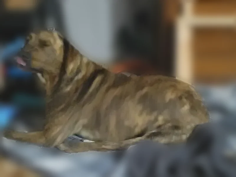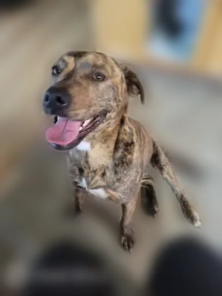 Zelda has brown and light color brindle patter and a white patch on her chest as well as a small healed tear in her ear. She's medium/large build like lanky lab.