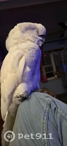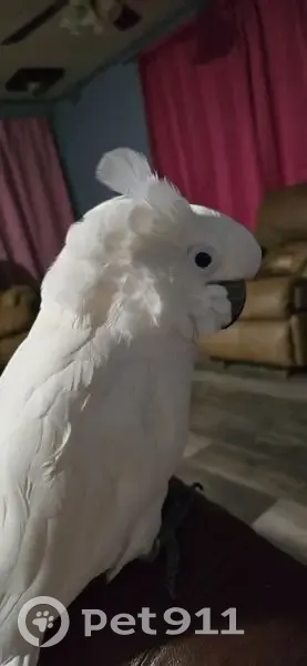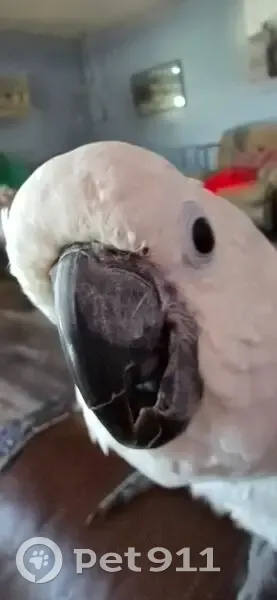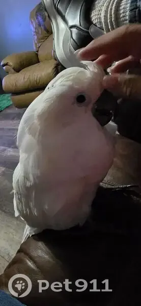 Bella is a white umbrella cockatoo with yellow under her wings. She does have a band on her leg also. She knows how to say her name and nite nite. Usually only coming to me. I had her in her cage outside while I came inside to let someone in. Wasn't gone even 5 when I went back to get her and she had broke out. And was gone. She is fully flighted. But has never done anything like this before. I'm sure she is scared.