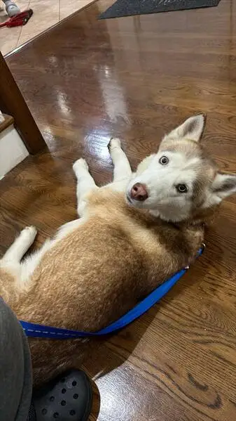 Very friendly female husky German shepherd mix found in the heights terrace in hazleton. She has blue eyes and blonde face with a darker coat on her back, with a purple plaid collar