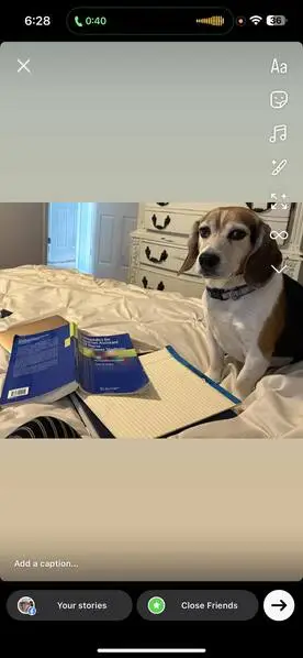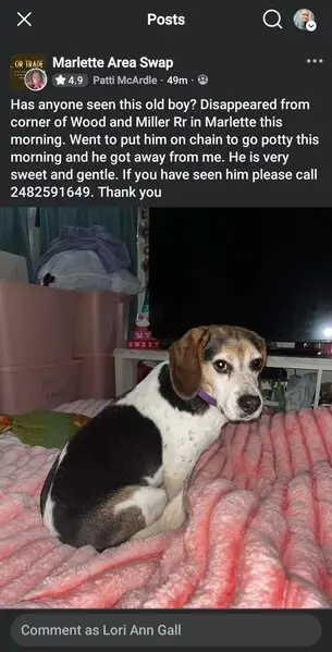 Lucky is a small male beagle with classic tri-color markings — brown, black, and white. He has a mostly white chest and legs, a brown face with a white stripe down his nose, and a black patch across his back. Lucky is very shy and timid, especially around strangers, and probably won’t come if called.