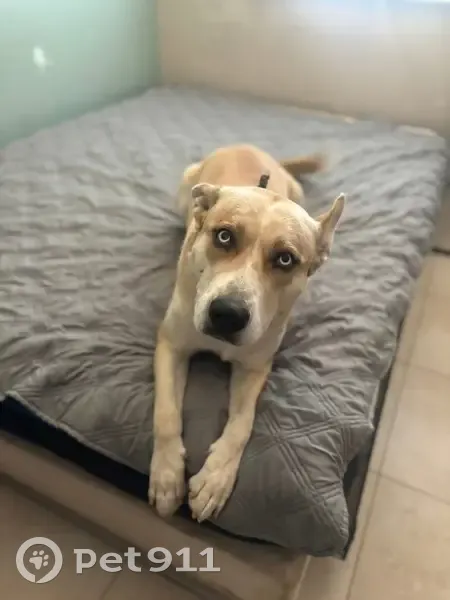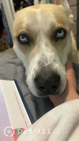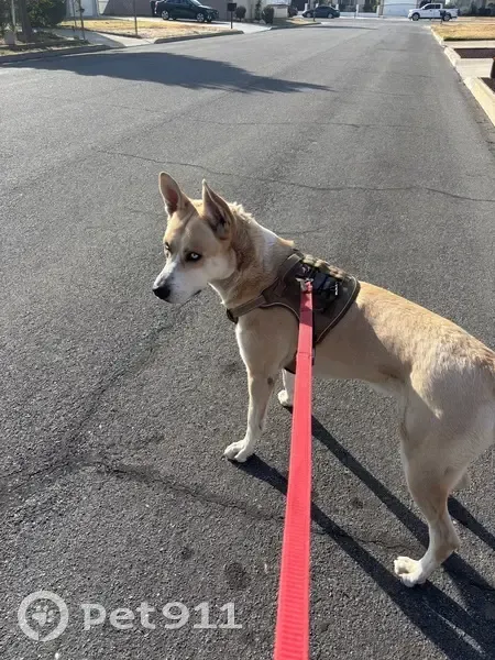 Tan/white, light blue/white colored eyes. Pointy ears. His eyes are very distinctive. He is about 4 years old and is very playful and energetic. No collar, no chip. He is not neutered.
