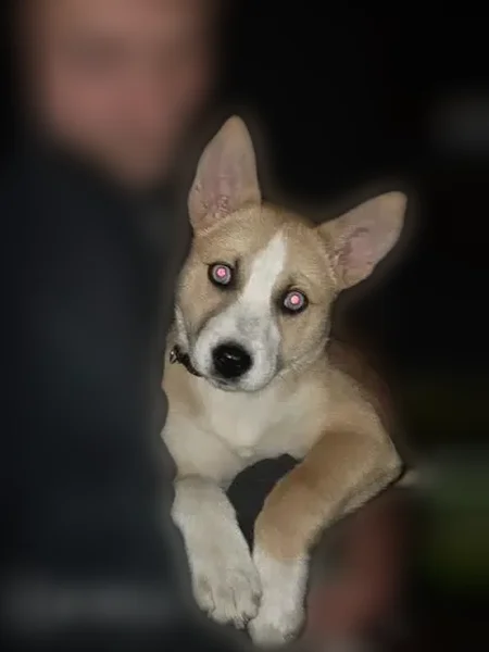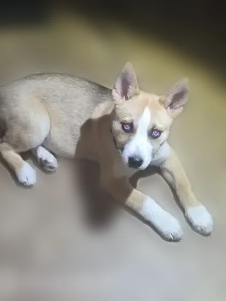 Tan/white white paws, black collar on, white strip on her nose. Pointy ears. Friendly, dramatic. Female, blue eyes.