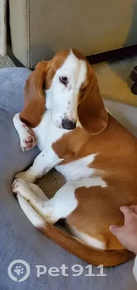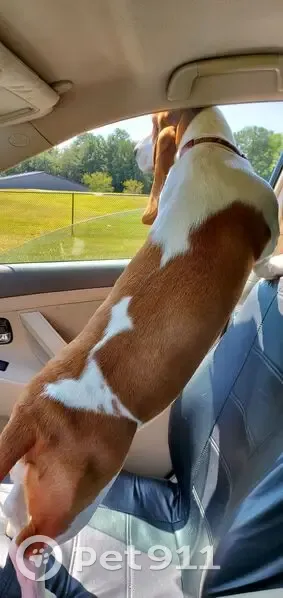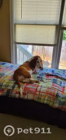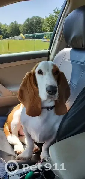 Roxy is a Bassett hound she is white with red spots, she has a pink camouflage collar on. She was outside using the restroom when they were cutting down trees and the tree fell and she got scared and ran off!