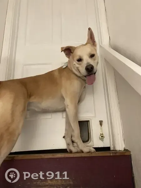 Very friendly and energetic, blonde with a bandana but no tags. Attached to an outdoor lead. Approached my car around 1am.