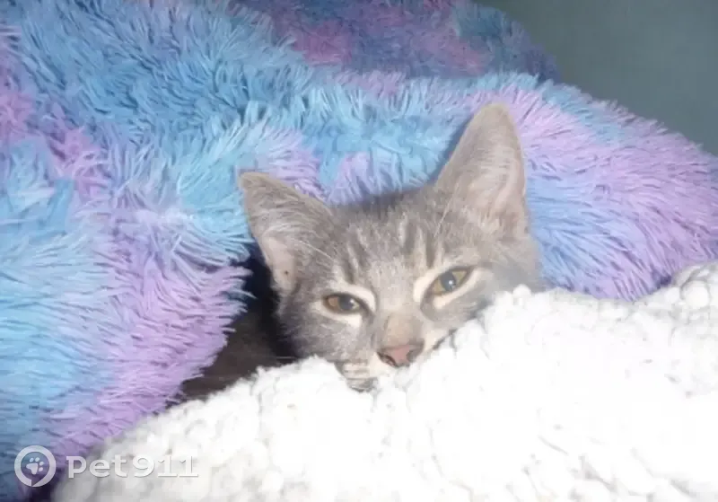 This is her baby picture. She is much larger now, about 12 pounds. She is a dark gray tiger, tabby cat with white stripes that can be hard to see. She is short hair, but very soft. INDOOR cat. She has copper/brownish eyes. She is just over 3 years old and she is fixed. She was being pet sat by a family member in Holland Patent, NY and may be trying to find her way home to Yorkville, NY. She is a sweet cat, but might be skittish around new people.
