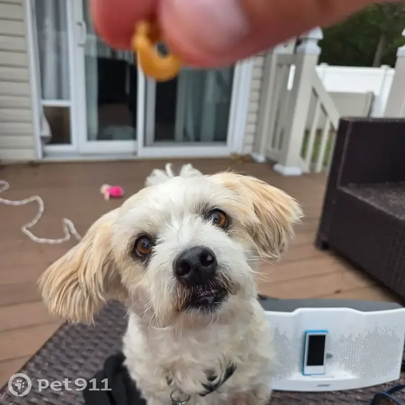 Charlie is a little white BichonPoodle mix… he escaped through a small opening on the side f the fence in the backyard. A neighbor saw him on his ring camera at 4:07 this afternoon, my landlord(the owner) alerted me immediately but by the time I got outside he was gone! We’ve been searching the neighborhood ever since.