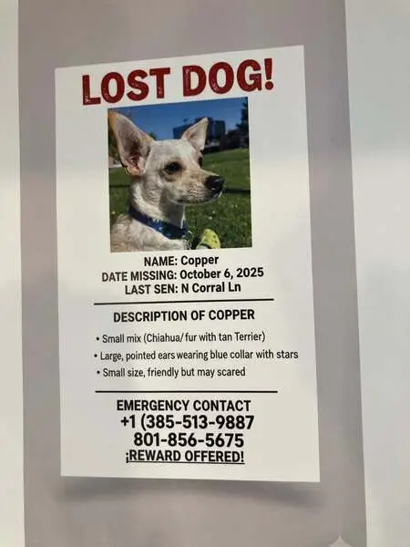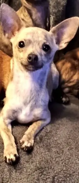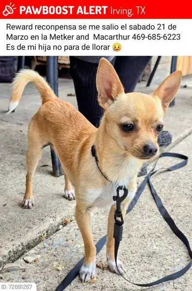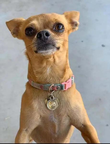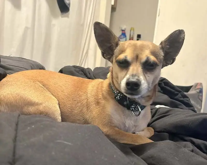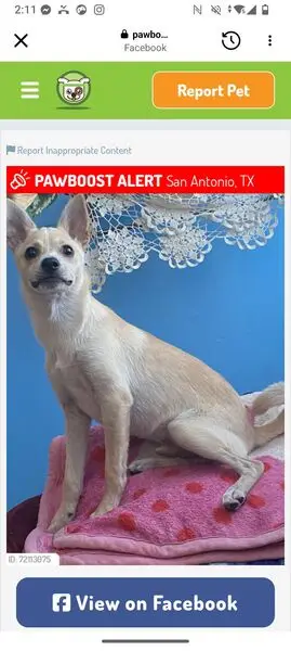 Tan colored. Light brown spots on her legs. Looks like may have had puppies, but can’t confirm that. Sweet but clearly scared and nervous. I can tell she hasn’t been on the street long.