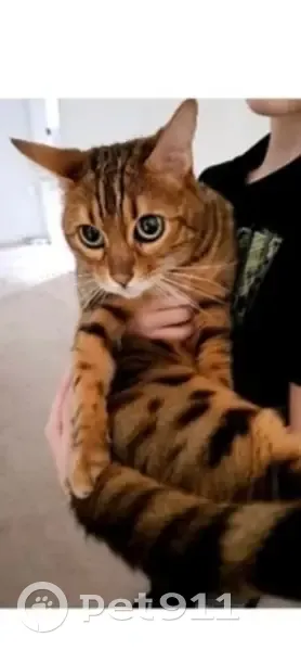 Female, spayed, Golden brown fur with black stripes, pink nose, green eyes, no collar. Not too friendly to people/scared unless she knows you. Snuck outside and didn’t realize until the next evening.