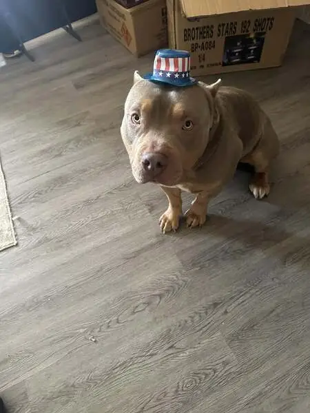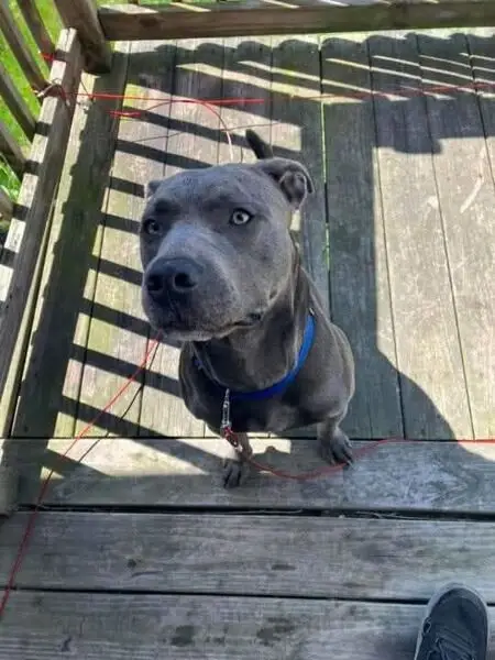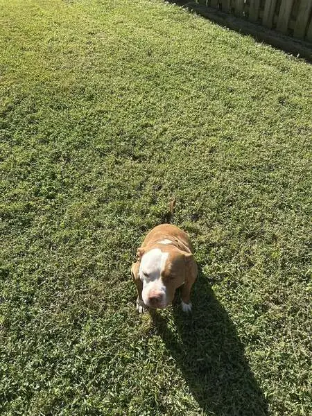 Looks to be a pitbull mix. White with brown spots. Judging by his teeth he seems to be very young. Not neutered. He was terrified so he instantly got in my car. He is very sweet and snuggly. Seems to be crate trained and potty trained. Nice to people. No collar no chip.