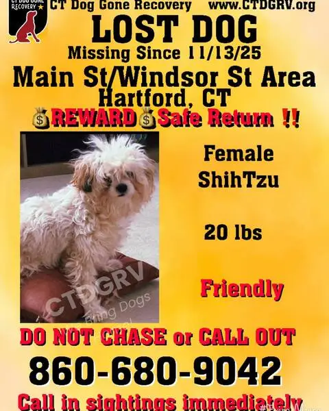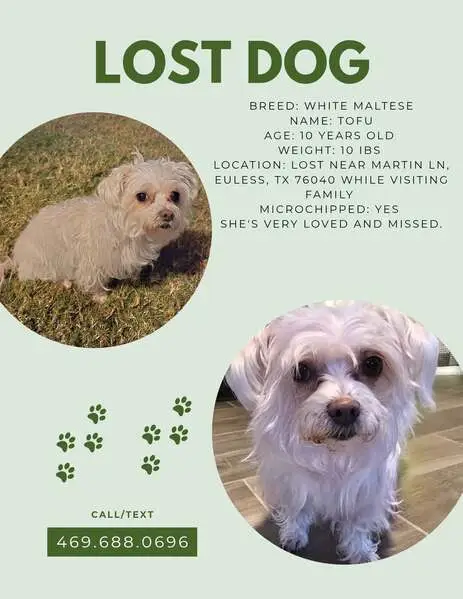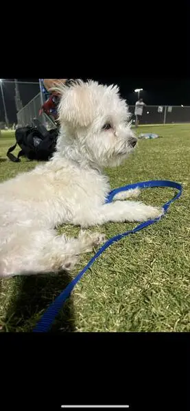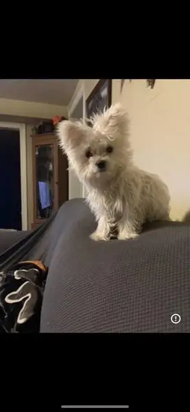 White Maltese mix, female, recently had puppies. Has an underbite and all white fur. Found tied to a pole outside Hibbett store on 1960 and Champions Forest with a note asking for someone to help her. Very friendly likes to be in someone's lap.