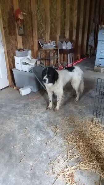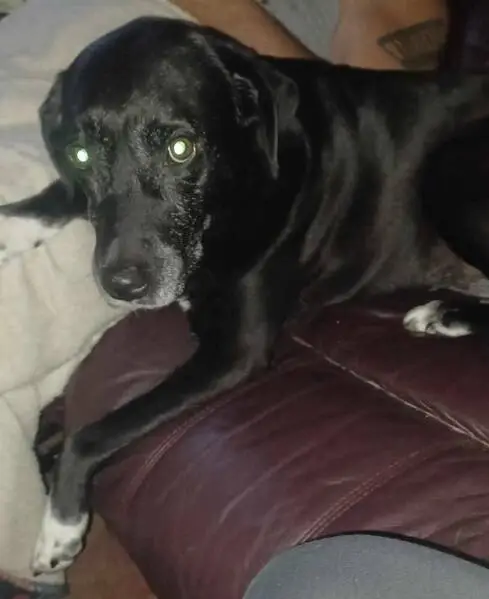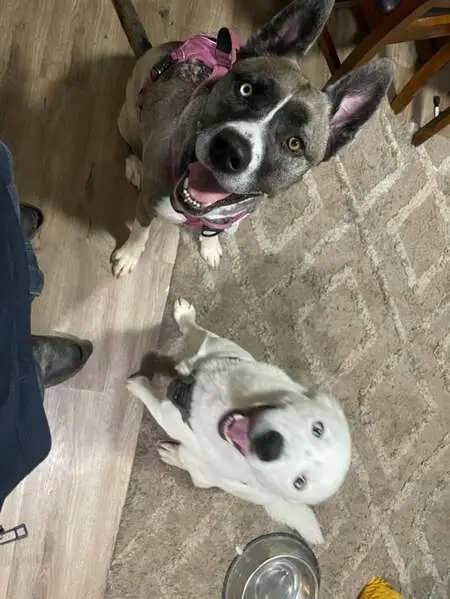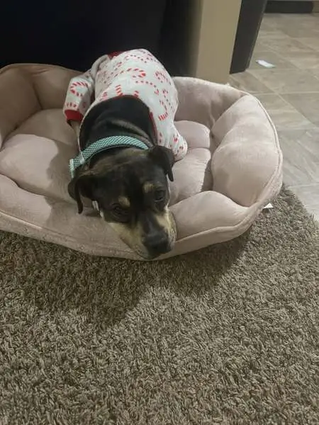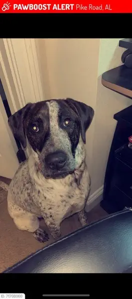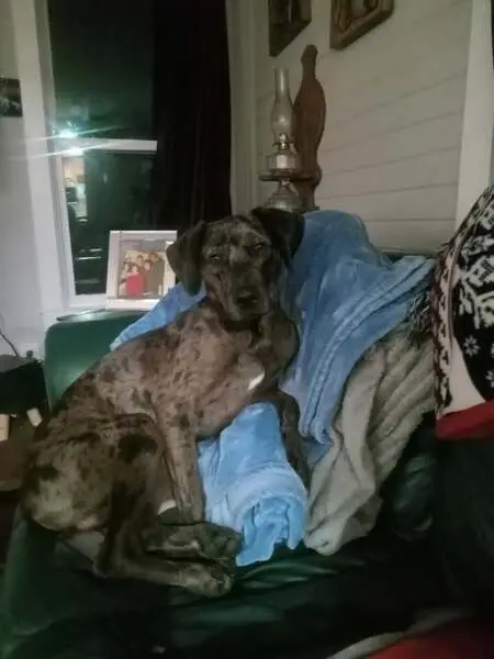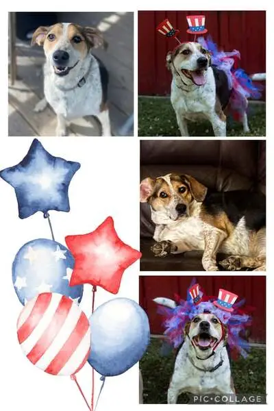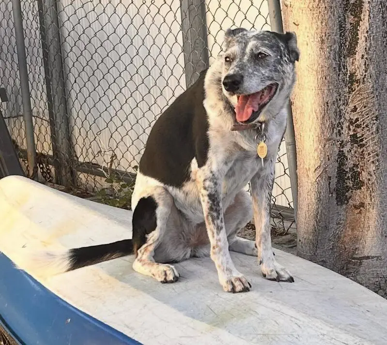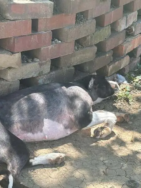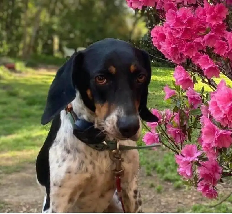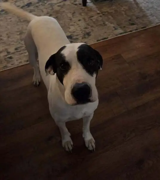 Male dog with short hair and Similar facial structure to a German Shorthaired Pointer. He has large black spots on his back, a black head and ears, and small black spots throughout his body.