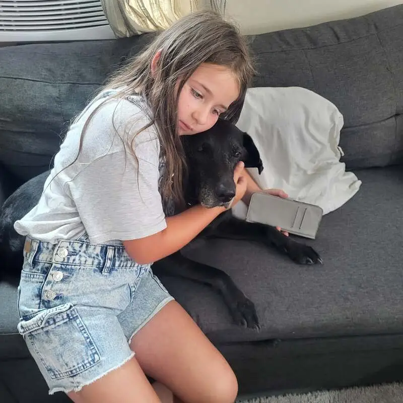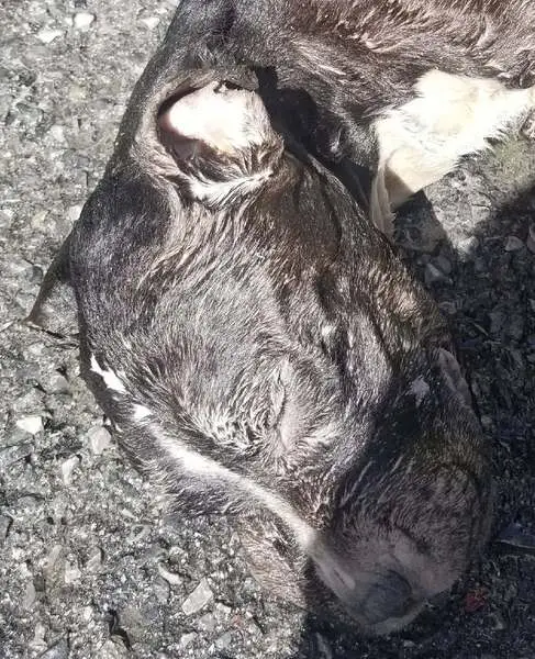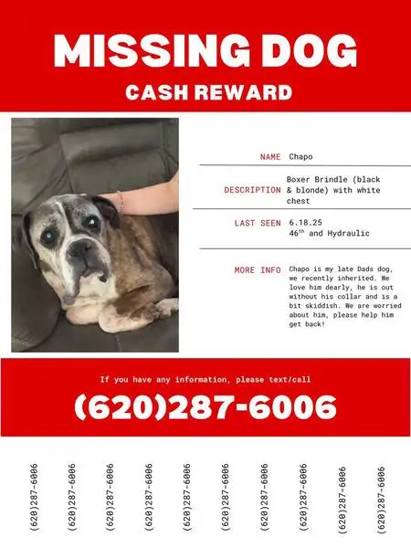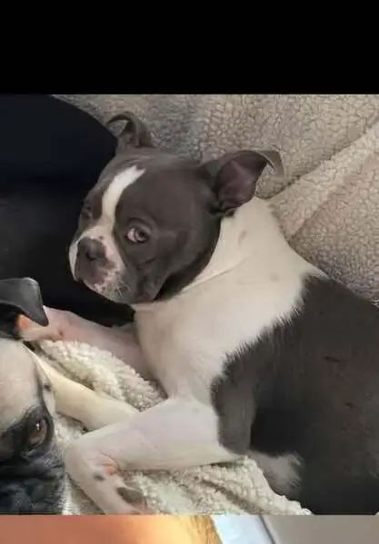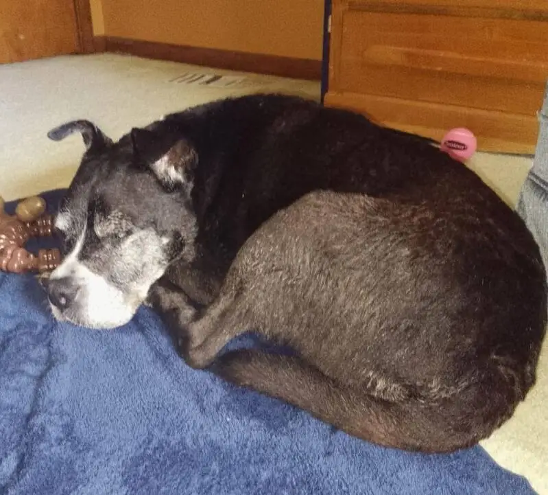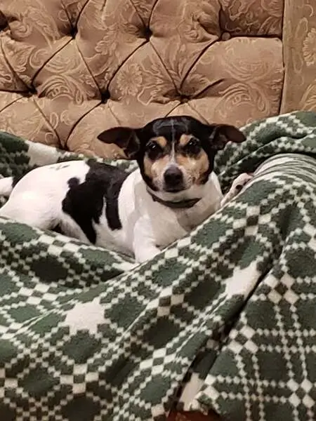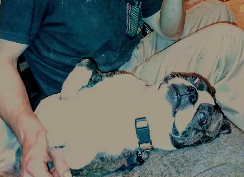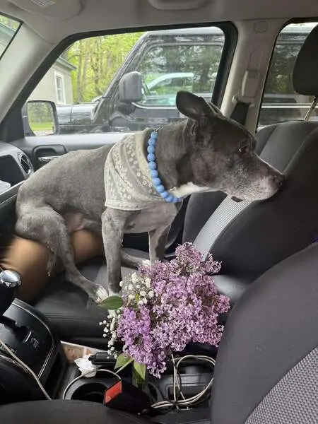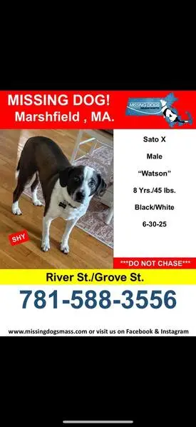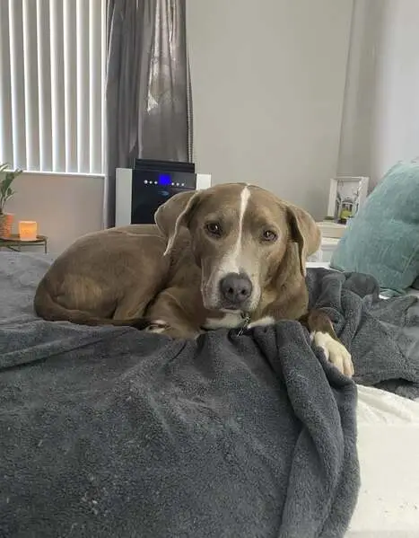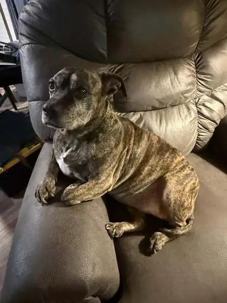 Male dog with short hair and Similar facial structure to a German Shorthaired Pointer. He has large black spots on his back, a black head and ears, and small black spots throughout his body.