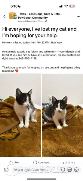 Hi everyone, I’ve lost my cat and I’m hoping for your help. He went missing today from 16422 Flint Run Way. He’s a male tuxedo cat (black and white fur) — very friendly and loved. If you see him or have any information, please contact me right away at 346-755-4158. Thank you so much for keeping an eye out and helping me bring him home ️