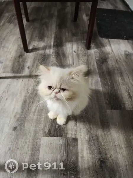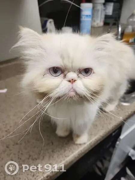 He has thick, long, soft white fur, some light blonde areas, like on his back, his paws, and his face, pink nose, blue eyes, no microchip, his chin is black because of the food and water he eats