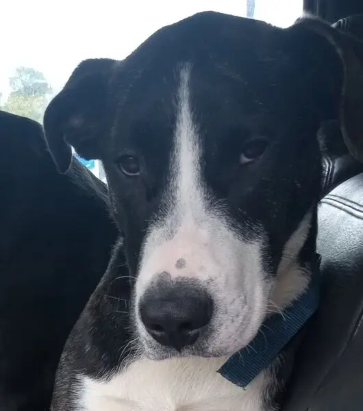Black white tan white spot above eyes and blue collar he was in the backyard night of oct 4 and went out Oct 5 morning to feed him then found out he was gone