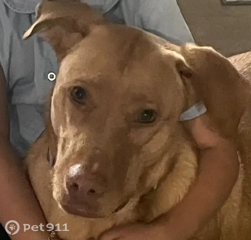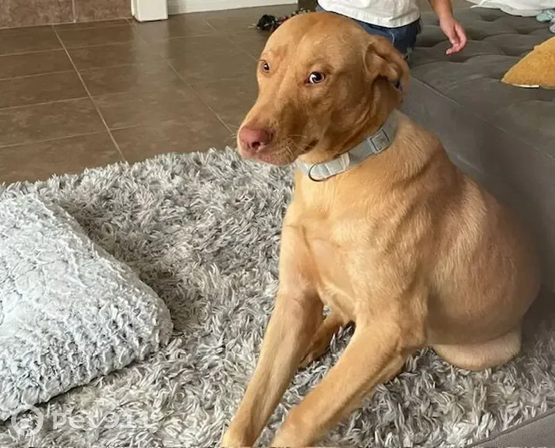 He is a 4-year-old Labrador mix, male, neutered, weighing between 60-70 lbs. He has a distinctive reddish-brown or "golden rust" coat and hazel eyes. He was not wearing his collar when he went missing, but he is microchipped.