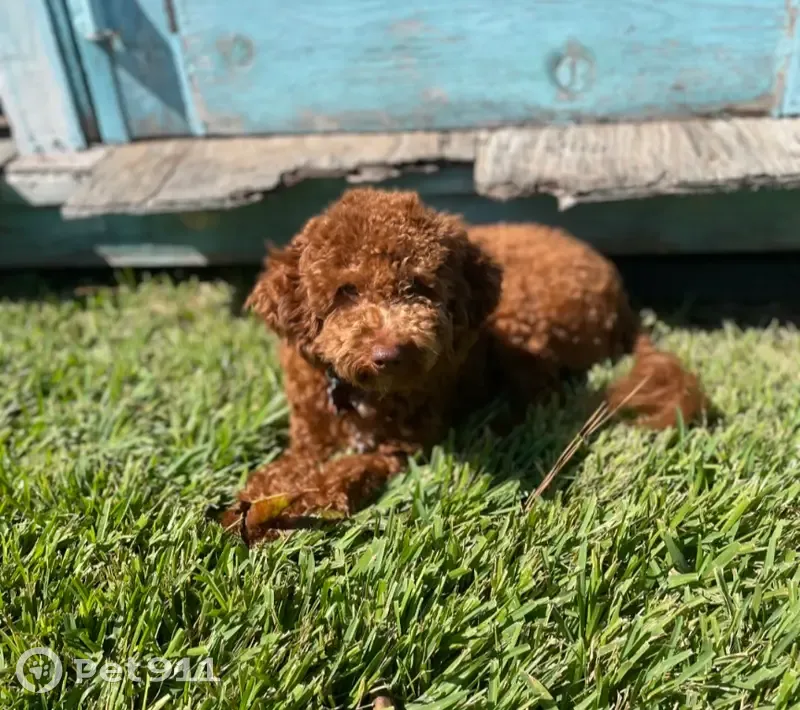 Brown, curly haired mini poodle mix with a brown nose. Hopefully she is with her sister Maggie!